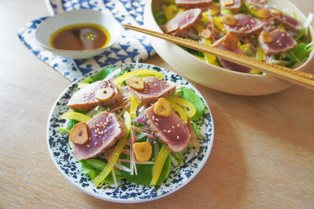 マグロをさっとソテーしてサラダにしてみました! ドレッシングも作ってお召し上がりください。 |